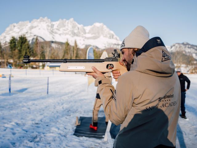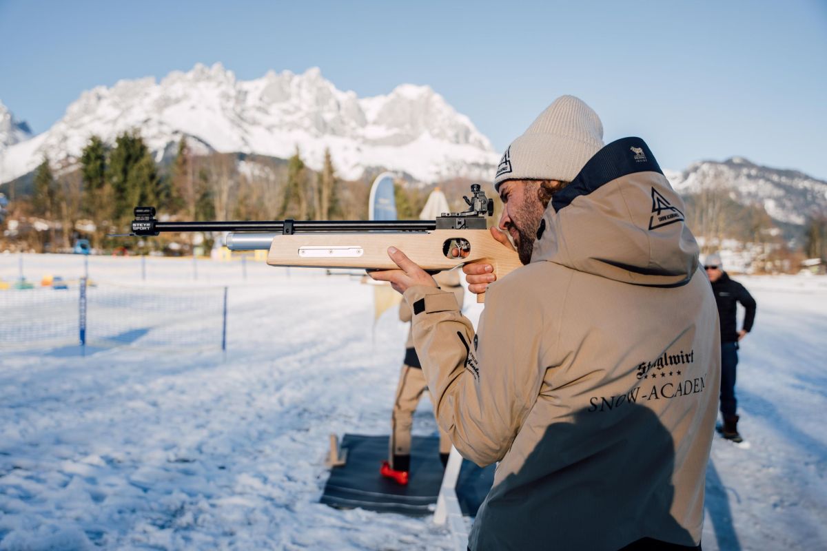 Unsere Biathlon-Area befindet sich direkt gegenüber dem Hoteleingang, auf malerischem Gelände mit herrlichem Bergpanorama des Wilden Kaisers. Nutzen Sie die vier perfekt präparierten Langlauf-Spuren auf unserem Hotelgelände und üben Sie punktgenaues Schießen an unseren Schießständen. Unsere Trainings für Anfänger und Fortgeschrittene sind entsprechend Ihrer Wünsche und Ihrem individuellen Können gestaltet, damit Sie für sich selbst das Beste herausholen können. Im Anschluss bieten unsere großzügigen Zimmer und Suiten genügend Raum für Erholung. Nutzen Sie gerne auch unsere umfangreichen Spa-Angebote, die vielfältigen Saunalandschaften oder unsere großzügigen Wasserwelten – für den perfekten Ausgleich nach einem sportintensiven Tag.
