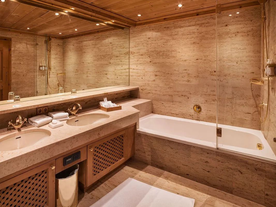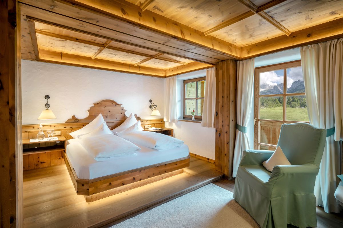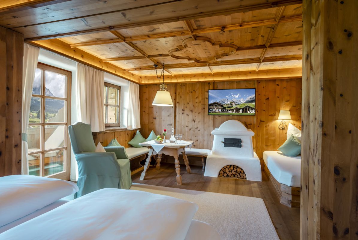 Comfortable combined bedroom and living space with highquality furniture and wood panelling made from Swiss stone pine, most with centrally heated tiled stove, walk-in wardrobe, bathroom with double washbasin, bathtub or generous rain shower, WC, seating area, lounge to relax on, telephone, Wi-Fi, mini-bar, safe, flatscreen TV, Nespresso machine incl. sustainable capsules (due to limited space in the Biohotel Studio only available on request), balcony or terrace – view on the ̔Wilder Kaiser̓ mountain or to the Lipizzaner studfarm