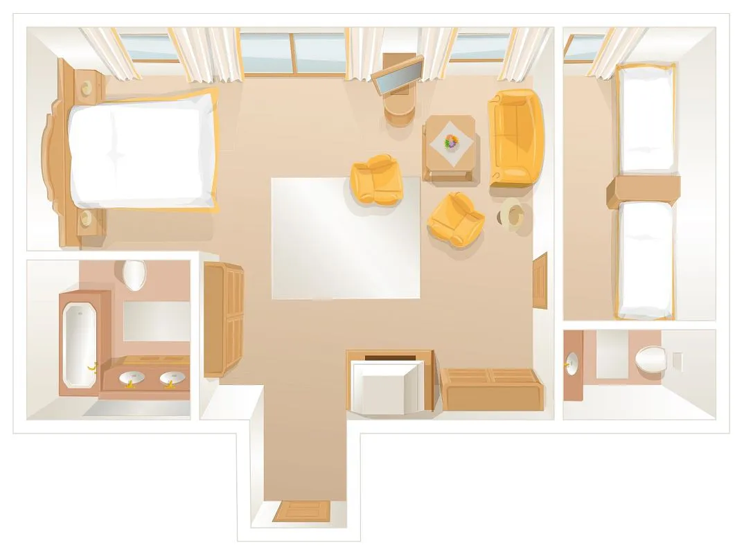 Spacious living room-bedroom with cosy lounge area and Vispring "Boxspring" bed, centrally heated tiled stove, small, separate children’s bedroom with 2 children’s beds and their own WC, large bathroom with double washbasin, bathtub and WC, telephone, Wi-Fi, mini-bar, safe, flatscreen TV, Nespresso machine incl. sustainable capsules, air-con, balcony with view on the ‘Kaiserwiese’