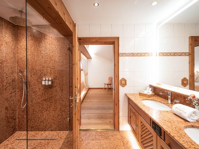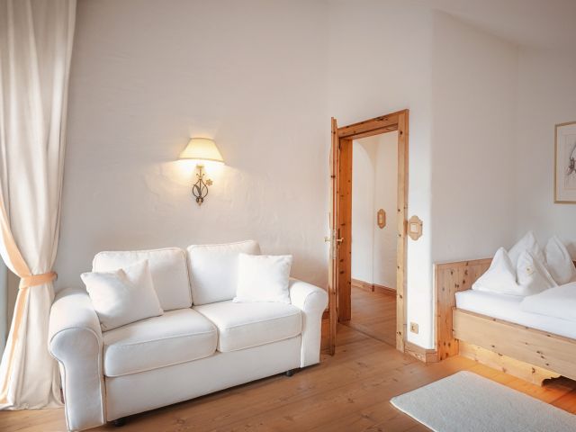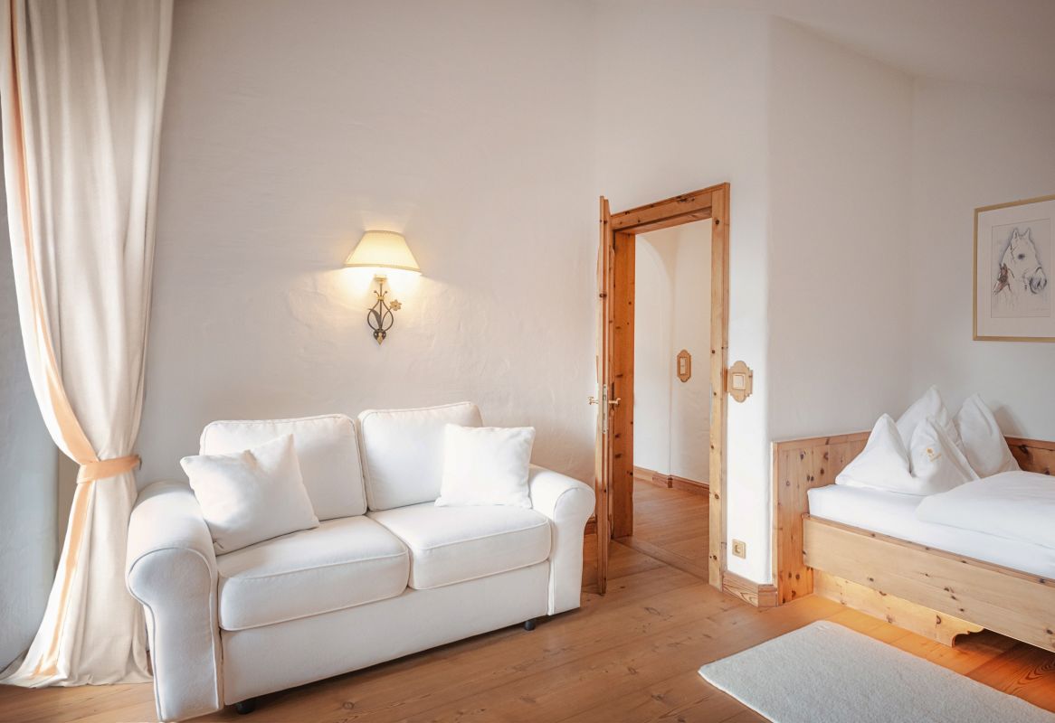 Light-suffused living room with cosy seating area, bedroom with Swiss stone pine double bed, children’s room with single bed and sofa bed, 1 bathroom with shower and double washbasin, separate WC, telephone, Wi-Fi, mini-bar, safe, each room has a flatscreen TV, Nespresso machine incl. sustainable capsules, south-facing balcony with a view of our Lipizzaner stud