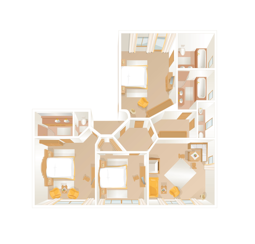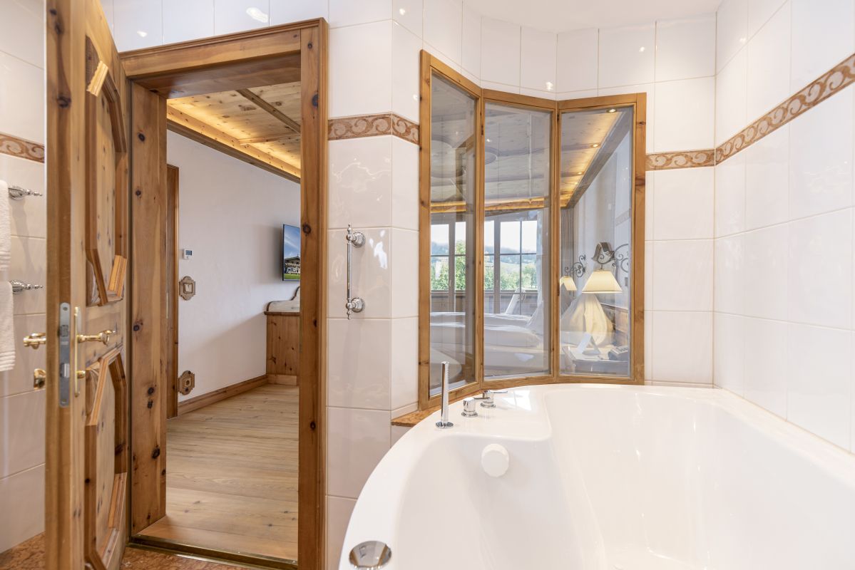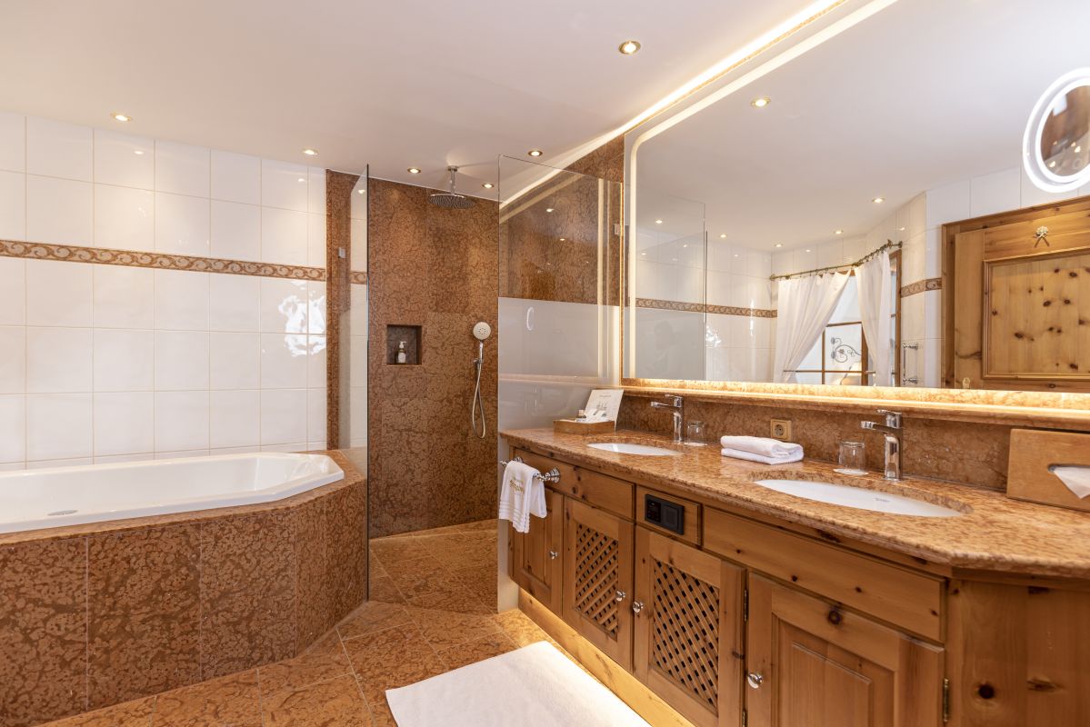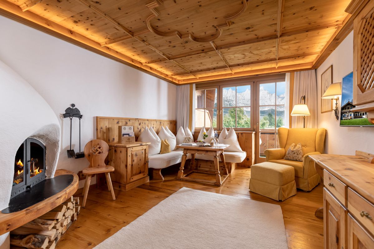 Living room with cosy lounge area, open fireplace, 3 bedrooms each of which has a Swiss stone pine bed, 3 bathrooms with shower, double washbasin and partly corner bathtub, separate WC, most have a walk-in wardrobe, telephone, Wi-Fi, mini-bar, safe, each room has a flatscreen TV, Nespresso machine incl. sustainable capsules, large terrace or balcony with view on the ‘Wilder Kaiser’ mountain