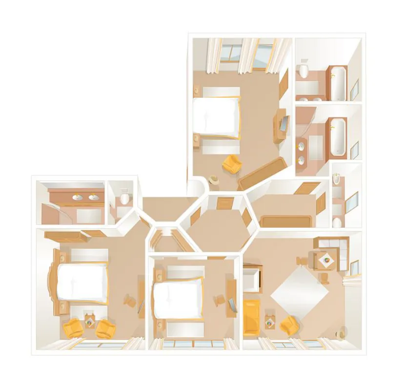 Wohnzimmer mit gemütlicher Lounge-Ecke, offener Kamin, 3 Schlafzimmer mit je einem Zirben-Doppelbett, 3 Badezimmer mit Dusche, Doppelwaschbecken und teilweise Eckbadewanne, getrenntes WC, großteils begehbarer Ankleideraum, Telefon, WLAN, Minibar, Safe, pro Zimmer ein Flatscreen-TV, Nespresso-Maschine mit nachhaltigen Kapseln, große Terrasse oder Balkon mit Blick zum Wilden Kaiser