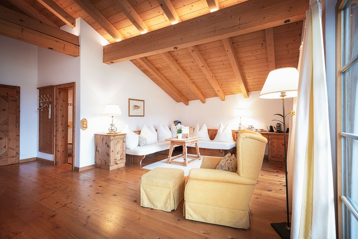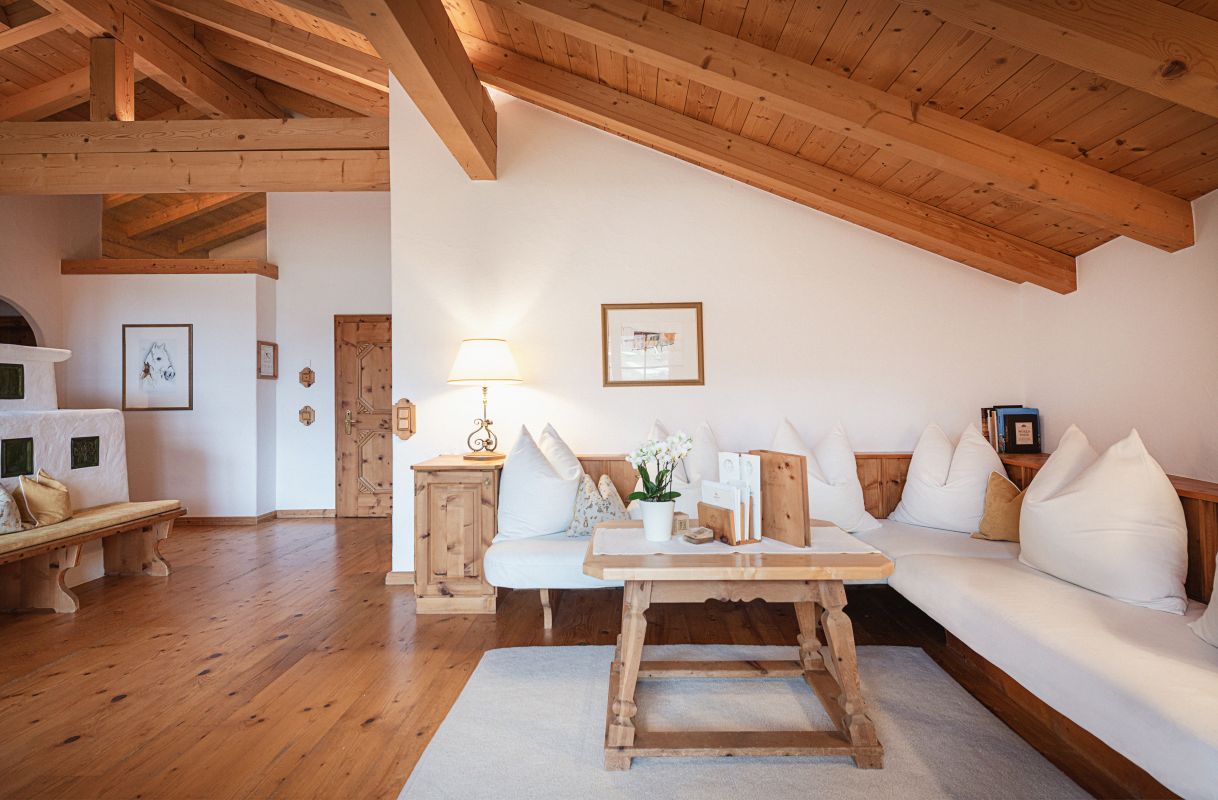 Sehr großzügiges Wohnzimmer mit Kachelofen, Sitzecke mit Esstisch sowie gemütlichem Lounge-Bereich, 2 oder 3 Schlafzimmer mit je einem Zirben-Doppelbett, 2 oder 3 Badezimmer mit Doppelwaschbecken, Eckbadewanne und Dusche, getrenntes WC, Telefon, WLAN, Minibar, Safe, pro Zimmer ein Flatscreen-TV, Nespresso-Maschine mit nachhaltigen Kapseln, großer Balkon mit Blick zum Wilden Kaiser und auf die Kaiserwiese