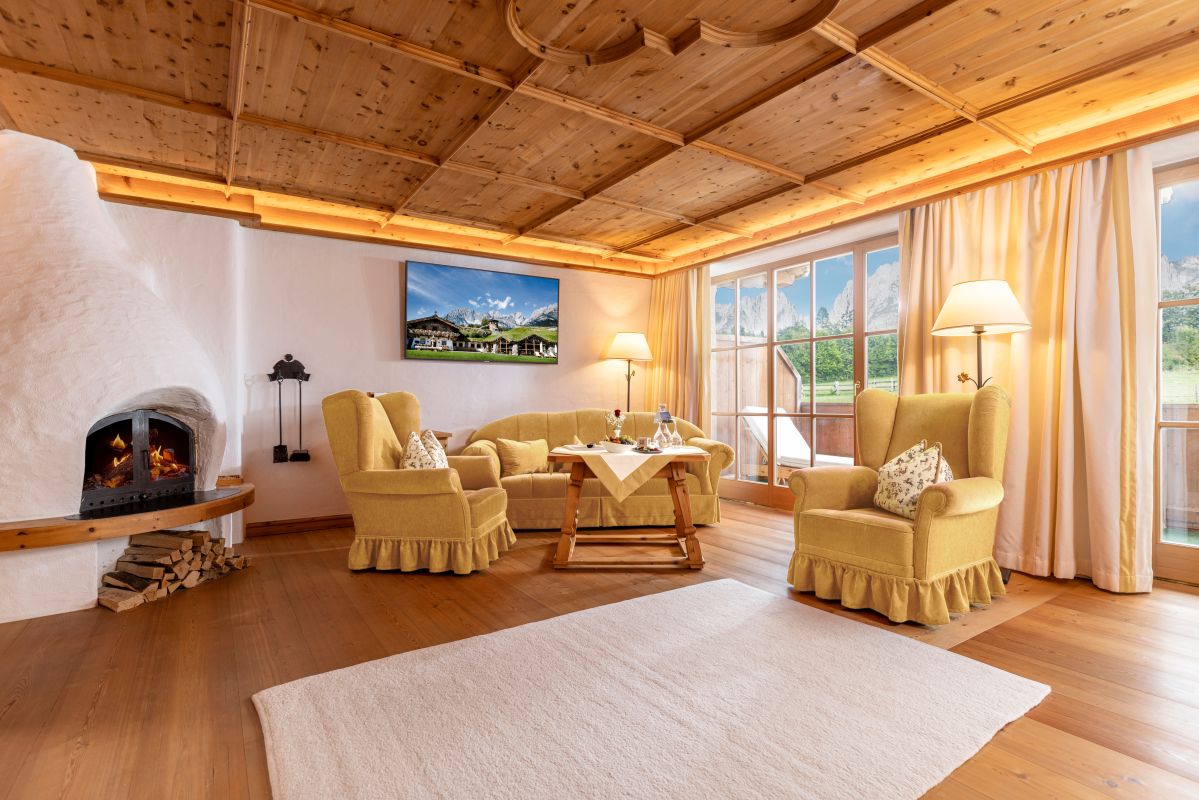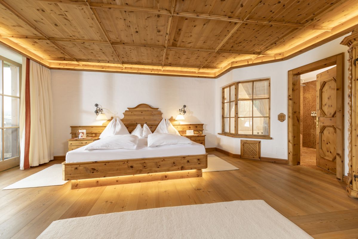 Large living room-bedroom with Swiss stone pine double bed and cosy lounge area, most have an open fireplace, spacious bathroom with double washbasin, corner bathtub and shower,separate WC, walk-in wardrobe, telephone, Wi-Fi, mini-bar, safe, flatscreen TV, Nespresso machine incl. sustainable capsules, large balcony or terrace with view on the ‘Wilder Kaiser’ mountain and/or sheep meadow