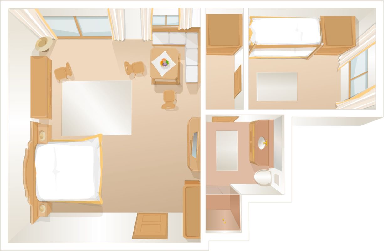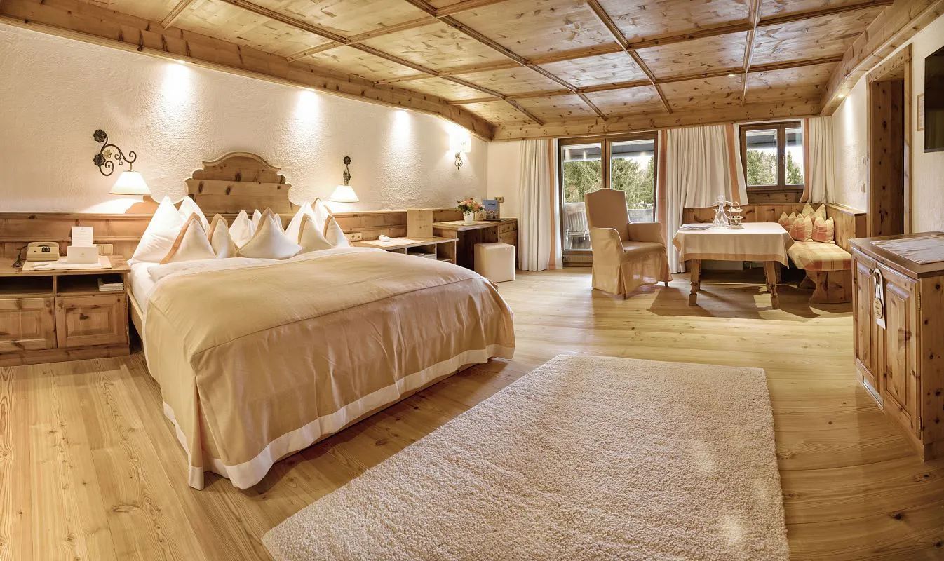 Cosy family-room with Swiss stone pine furniture, bedroom, seperate children’s bedroom with bunk beds or twin-beds, bathroom with bath tub or shower/WC, 2nd small bathroom telephone, Wi-Fi, minibar, safe, flatscreen TV, Nespresso machine incl. sustainable capsules (due to space limitations only available on request in certain rooms), partly balcony, mostly street side and no view on the ‘Wilder Kaiser’ mountain