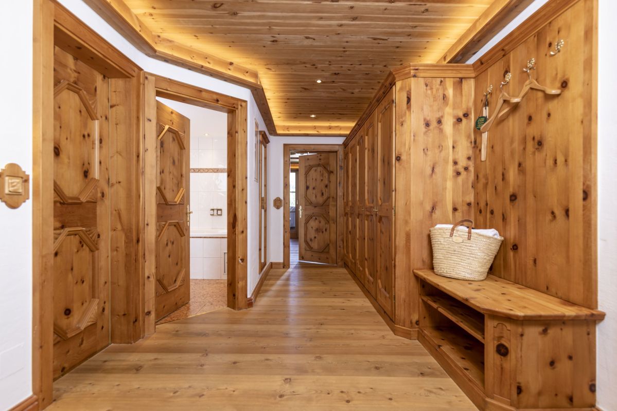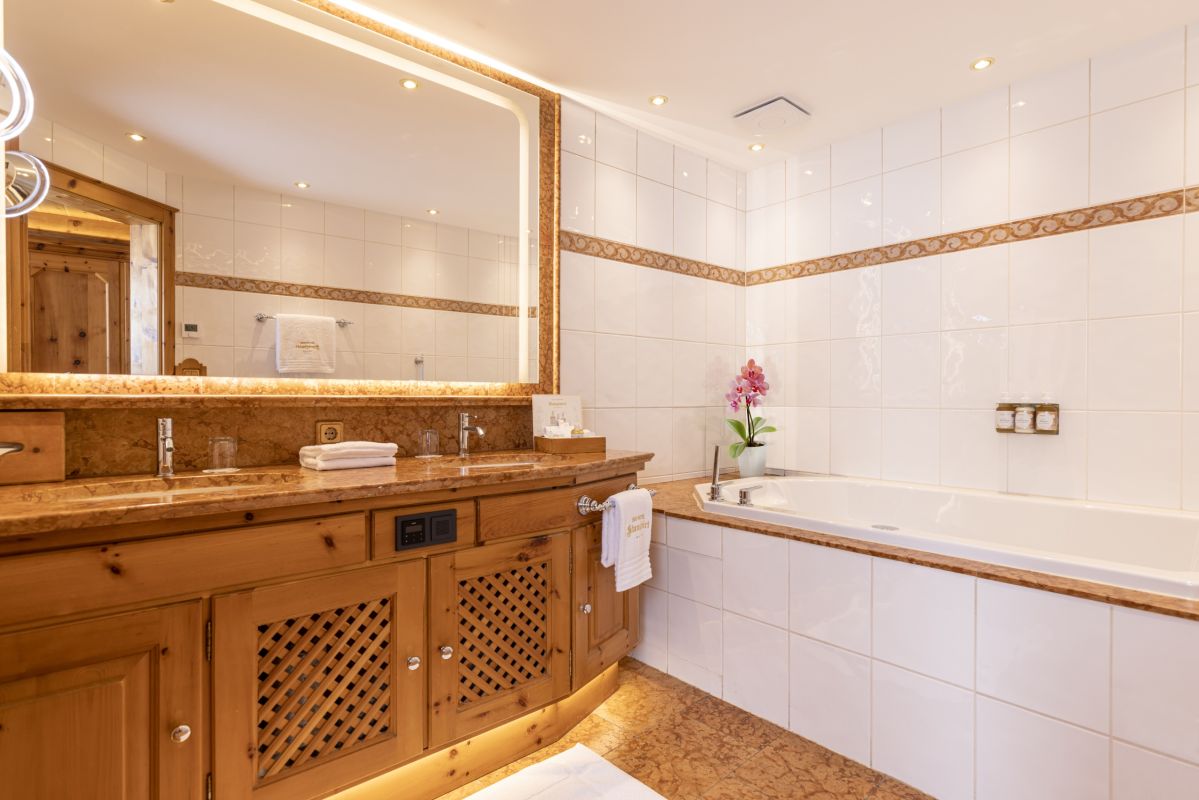 Living room with cosy lounge area and centrally heated tiled stove, 2 bedrooms each of which has a Swiss stone pine double bed, 1 bathroom with double washbasin and bathtub, 2nd small bathroom with shower, separate WC, telephone, Wi-Fi, mini-bar, safe, each room has a flatscreen TV, Nespresso machine incl. sustainable capsules, 2 large balconies, of which one has view on the ‘Wilder Kaiser’ mountain