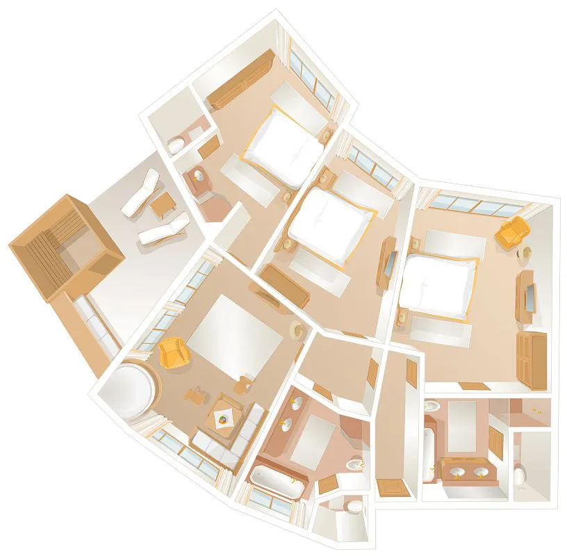 Living room with cosy lounge area and open fireplace, 3 bedrooms each of which has Swiss stone pine double bed, 2 bathrooms with double washbasin, bathtub and shower, additional shower and washbasin in a bedroom, separate WC, telephone, Wi-Fi, minibar, safe, each room has a flatscreen TV, Nespresso machine incl. sustainable capsules, air-con, private roof-top terrace with sauna hut and lounge area