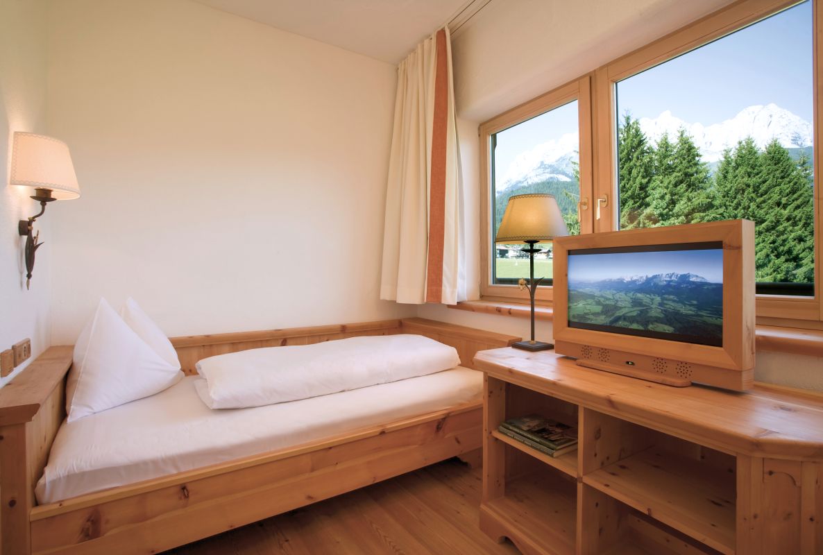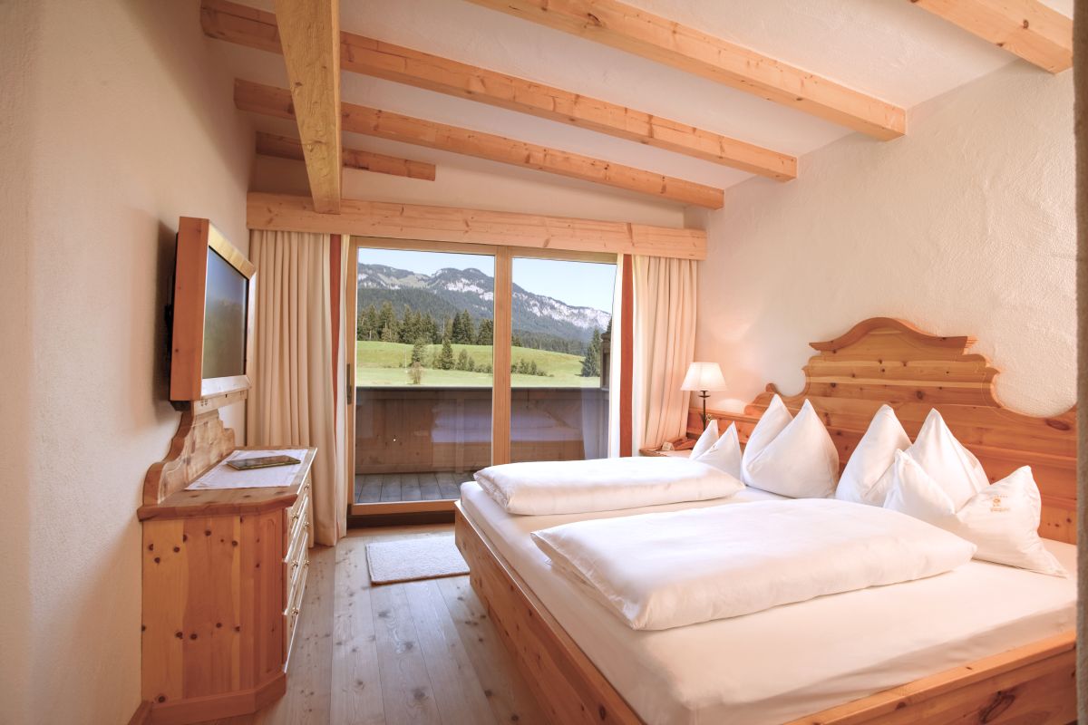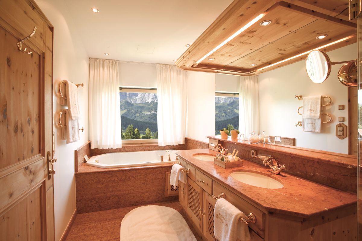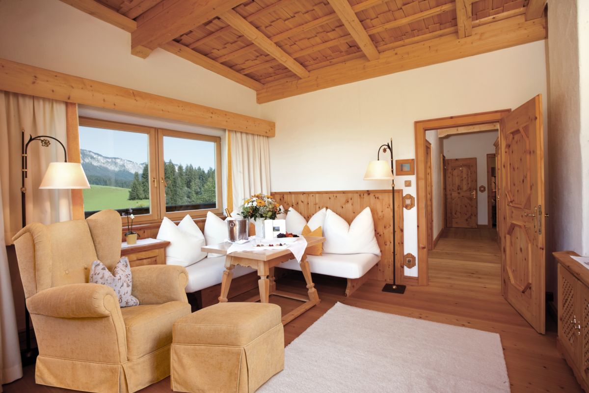Wohnzimmer mit gemütlicher Lounge-Ecke und offenem Kamin, hochwertige Zirbenholzmöbel, 2 Schlafzimmer (davon 1 x mit getrennten Betten), 1 Badezimmer mit Doppelwaschbecken, Badewanne und Dusche/WC, zweites kleines Badezimmer mit Waschbecken und Dusche/WC, Telefon, WLAN, Minibar, Safe, pro Zimmer ein Flatscreen-TV, Nespresso-Maschine mit nachhaltigen Kapseln, Klimatisierung, großer Balkon mit Blick zum Wilden Kaiser
