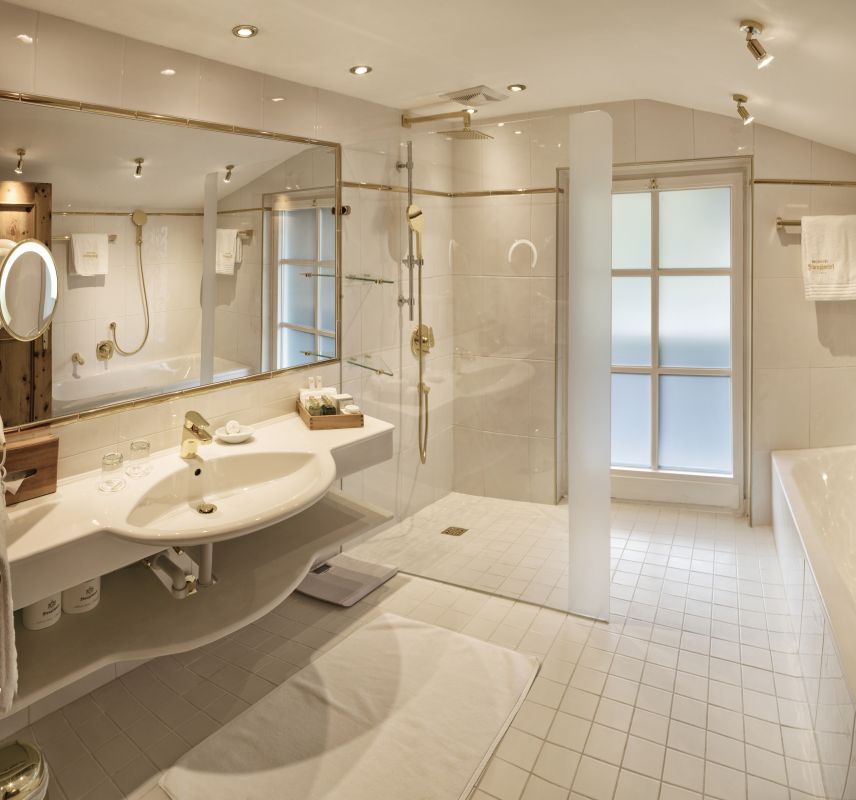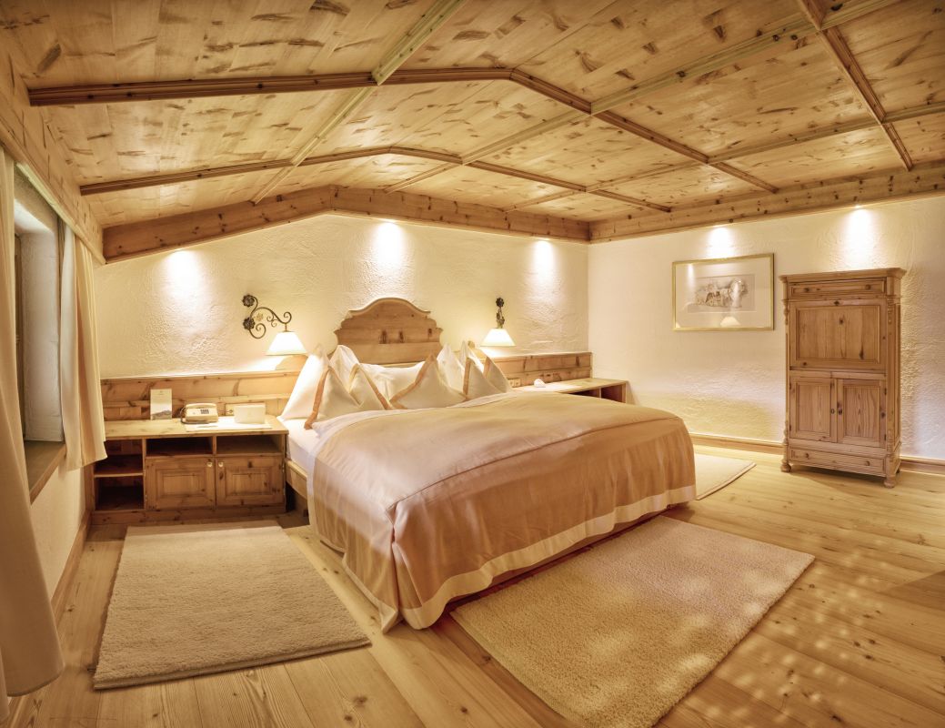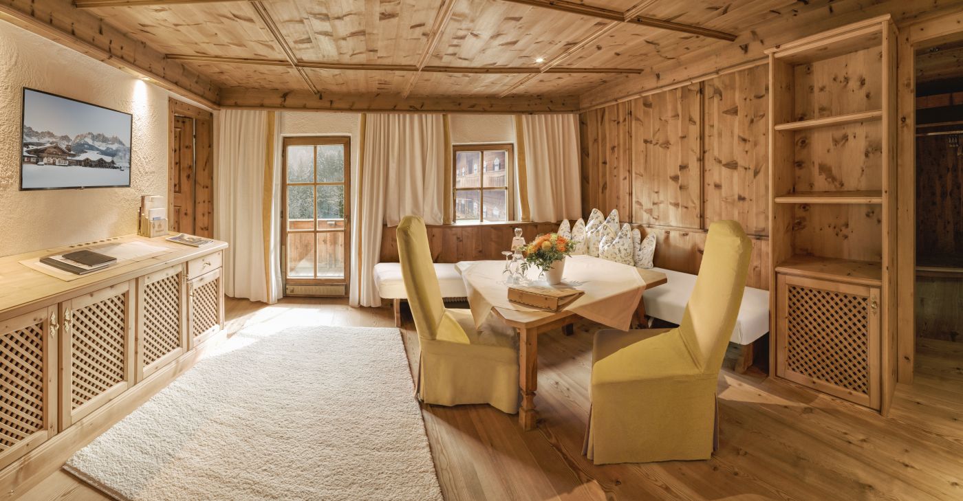 Großzügige Familien-Einheit mit hochwertigen Zirbenholz-Möbeln, großes Eltern-Schlafzimmer, gemütliches Wohnzimmer, separates Kinderzimmer mit Stockbett, Badezimmer mit Badewanne und Dusche / WC, begehbarer Kleiderschrank, Telefon, WLAN, Minibar, Safe, Flatscreen-TV, Nespresso-Maschine mit nachhaltigen Kapseln, straßenseitig, Balkon mit Blick auf den Traditions-Gasthof